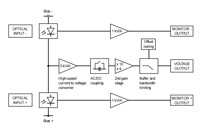 HBPR系列的光接收器/光检测器由两个反并联连接的光电二极管和随后的低噪声跨阻放大器组成。光电二极管经过精心选择和成对匹配,以实现尽可能高的共模比(CMRR)。 低输入噪声(NEP)和共模为MHz范围内的平衡光接收器设定了标准,并实现了高灵敏度的信号检测。 即使在高重复率和快速变化的信号形状(例如在量子态层析成像中)的情况下,高带宽也可以准确检测激光脉冲。由于具有其他功能,例如可切换的带宽限制(低通滤波器),独立的快速监控器输出,可调节的偏移量和可切换的AC / DC耦合,HBPR系列的光接收器是用途广泛的平衡光接收器。